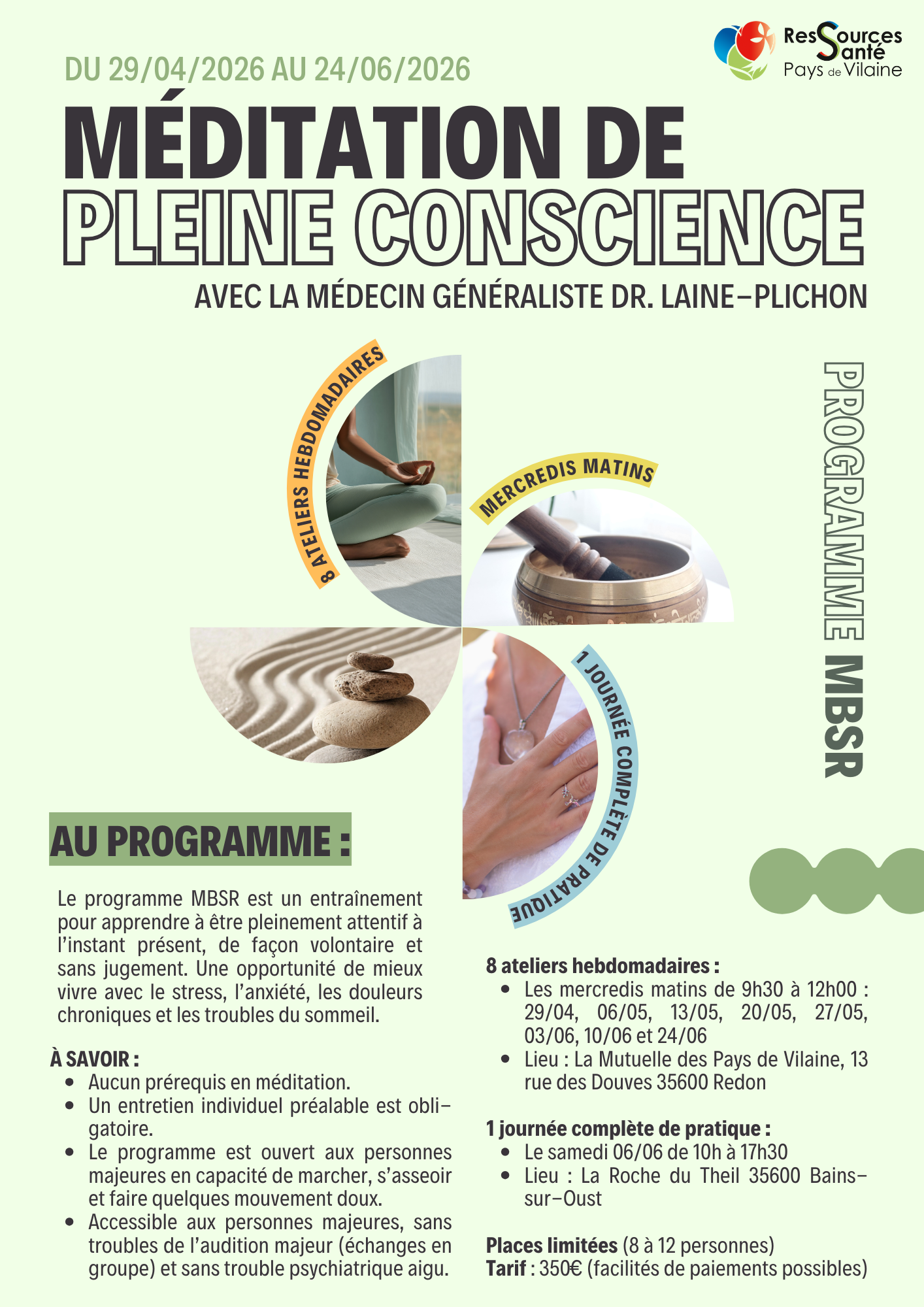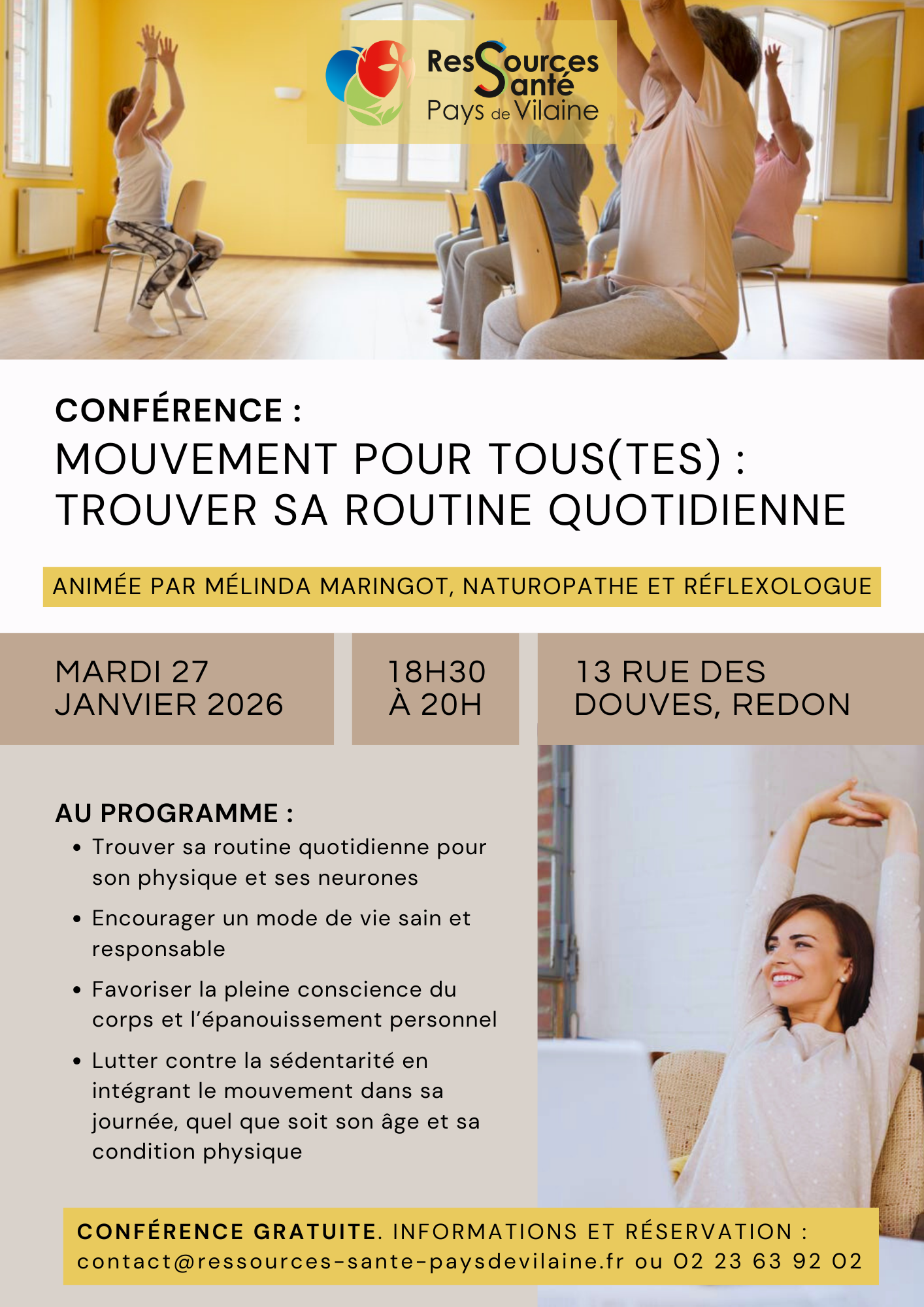 > Informations et réservation : Ressources Santé Pays de Vilaine, 02 23 63 92 02 ou à contact@ressources-sante-paysdevilaine.fr